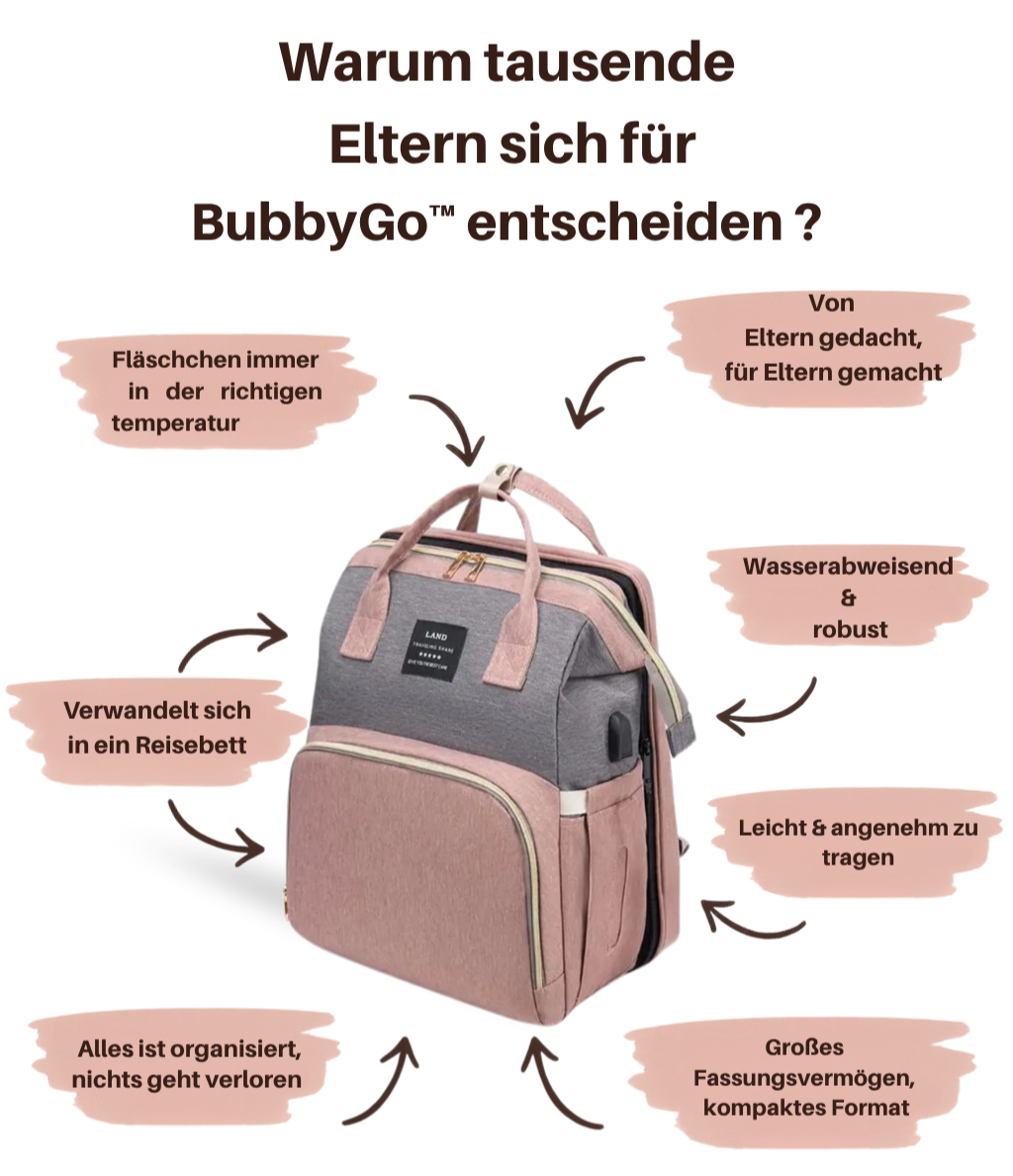 BubbyGo: die Tasche, die Ihr Baby überall verstaut, transportiert, wickelt und beruhigt wohin Sie auch gehen